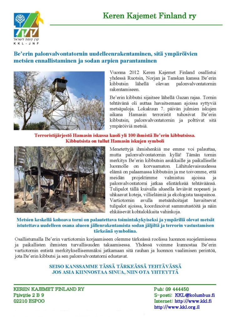 Keren Kajemet Finlandin uusi projekti – Kibbuts Be’erin palonvalvontatornin uudelleen rakentaminen, sitä ympäröivien metsien ennallistaminen ja sodan arpien parantaminen